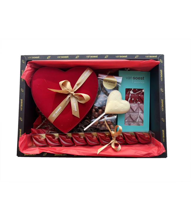 Explore our Valentine's Giftbox, a luxurious gift package filled with love-infused delights. Make your loved one's heart melt with a velvet heart containing artisanal chocolates, a box of Amsterdam kisses, a chocolate heart lolly, a heart-shaped praline bar, and a bag of chocolate pearls. A perfect combination of delightful treats for the most romantic day of the year!
